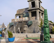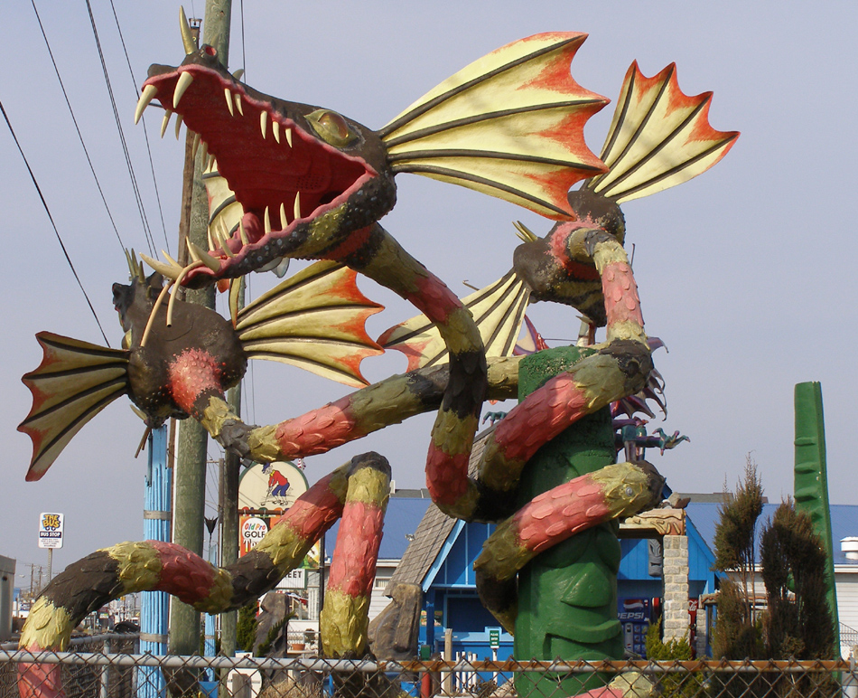 The 23rd St. course was being transformed into the Temple of Dragons course when the photos in the top row were taken in 2001. Since then, two animated, 700 pound dragons were installed (second row of photos). The 23rd St. course was the second Ocean City Old Pro location. It was built in 1965 and featured mostly original and politically incorrect African images. The golfer is still there. The statue with the headdress has been turned into an undersea diver. Updating is part of Old Pro's strategy in keeping up with all the other modern courses in the area. In this 10-mile stretch of Ocean City, there are about 30 mini golf courses. [map]