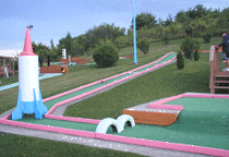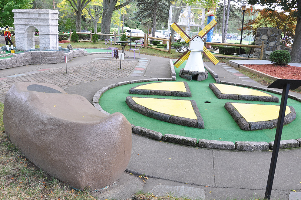 Sportsworks, now Champions Golf Center, has two mini golf courses, a driving range, and batting cages. Some of the holes are very long and make full use of the hillside setting. There was previously a Rinky Dink course at this site which was built in 1987. Rinky Dink was a mini golf chain that appears to still have locations in Batavia, NY, Rochester, NY, and Medina, OH. When Sportsworks took over this place in 1993, they kept just the concrete and framing of each hole and built the obstacles and decorative elements from scratch. [map]