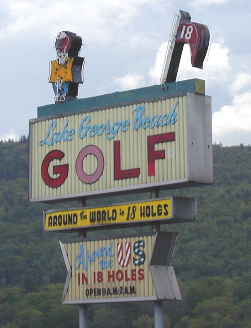 Around the World Mini Golf is one of the most elaborate and incredible mini golf facilities in the country. It has been here since at least the 1970s. I believe it probably opened in the 1960s. Each hole has a separate theme and elaborate well-maintained figures and structures. The "Around the U.S." course represents different states while the "Around the World" courses features different countries. The carpeted greens include faux sand traps. The courses are still tweaked a little but most is original. In 2002, the 18th hole of the American course was changed to depict the New York subway. In 2003, the owner added a roulette wheel to the Las Vegas hole. There was once a single-course Around the World Mini Golf in Lake Placid, NY with an international theme. This course was created and run by the same man. However, it was demolished and replaced with a Pirate's Cove (modern chain course). This Paul Bunyan statue was produced by International Fiberglass. It was originally installed at the Oregon Pavilion at the 1964-1965 New York World's Fair. The course had a neon sign (first photo above circa 2001) which has been replaced with a plastic box sign (second photo). For more, see this website. [map]