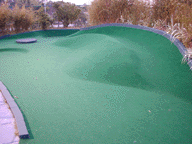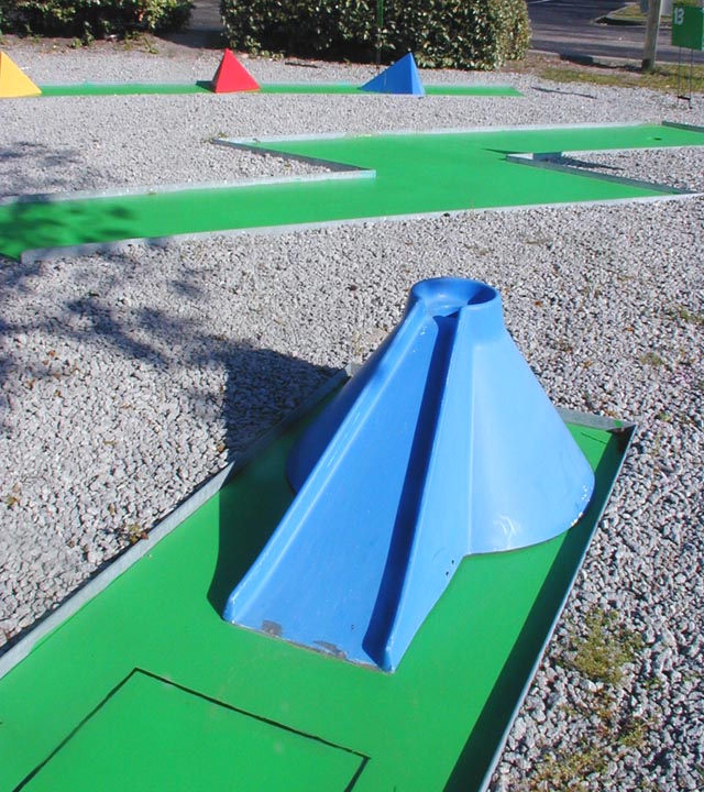 Golfers are given leis when they arrive at the Rumble. Hawaiian music (of the Elvis variety) and Jimmy Buffett songs play throughout the course. The volcano (made of concrete NOT foam) was a prop from the movie "Chasers". It emits flames and steam. The greens are immaculate, the landscaping is lush and there are Hawaiian names for each hole. [map] Also on site was the Training Center for the USPMGA (U.S. Professional Mini Golf Association) which hopes to raise the status of mini golf to the Olympic level. This uncarpeted, 18-hole course was not open to the public. By 2012, the course seemed abandoned. By 2017, it had been replaced with batting cages. For another example of this style course, see the Team USA Training Center in Jackson, WI. |