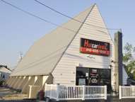 | This unidentified building features a folded plate roof. The building was apparently vacant in 2009. It recently housed Dunbar's BBQ but is vacant again. Does anyone know what the original occupant was? It was apparently a fast food restaurant or ice cream stand. [map] |