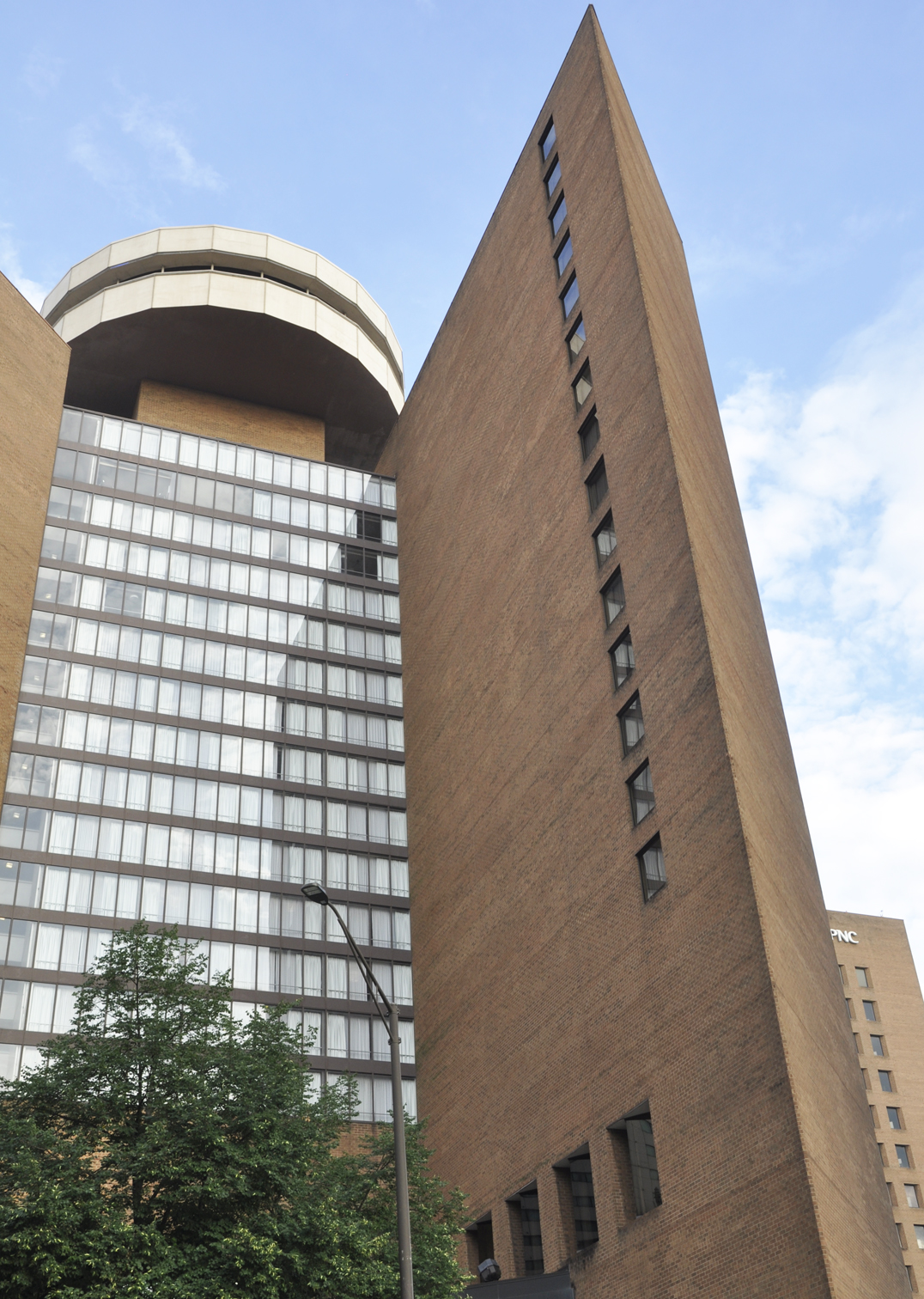 The Hyatt Regency is part of the PNC Center which was designed by Browning Day Pollak Associates and built from 1974-1977. The building originally housed Merchants Plaza, the headquarters of Merchants National Bank and Trust Company. It became the PNC Center in 2010. The round structure at the top of the building is part of the original design and houses the Eagle's Nest, a revolving restaurant. For more, see this website. [map]