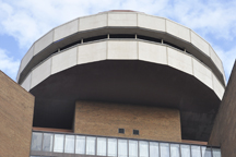 The Minas parking garage was built in 1960 for the E.C. Minas department store which operated from 1894-1984. It features pebbled concrete screens. In 1981, the parking garage was sold to the First Baptist Church. The vertical sign was adapted at that time. [map]