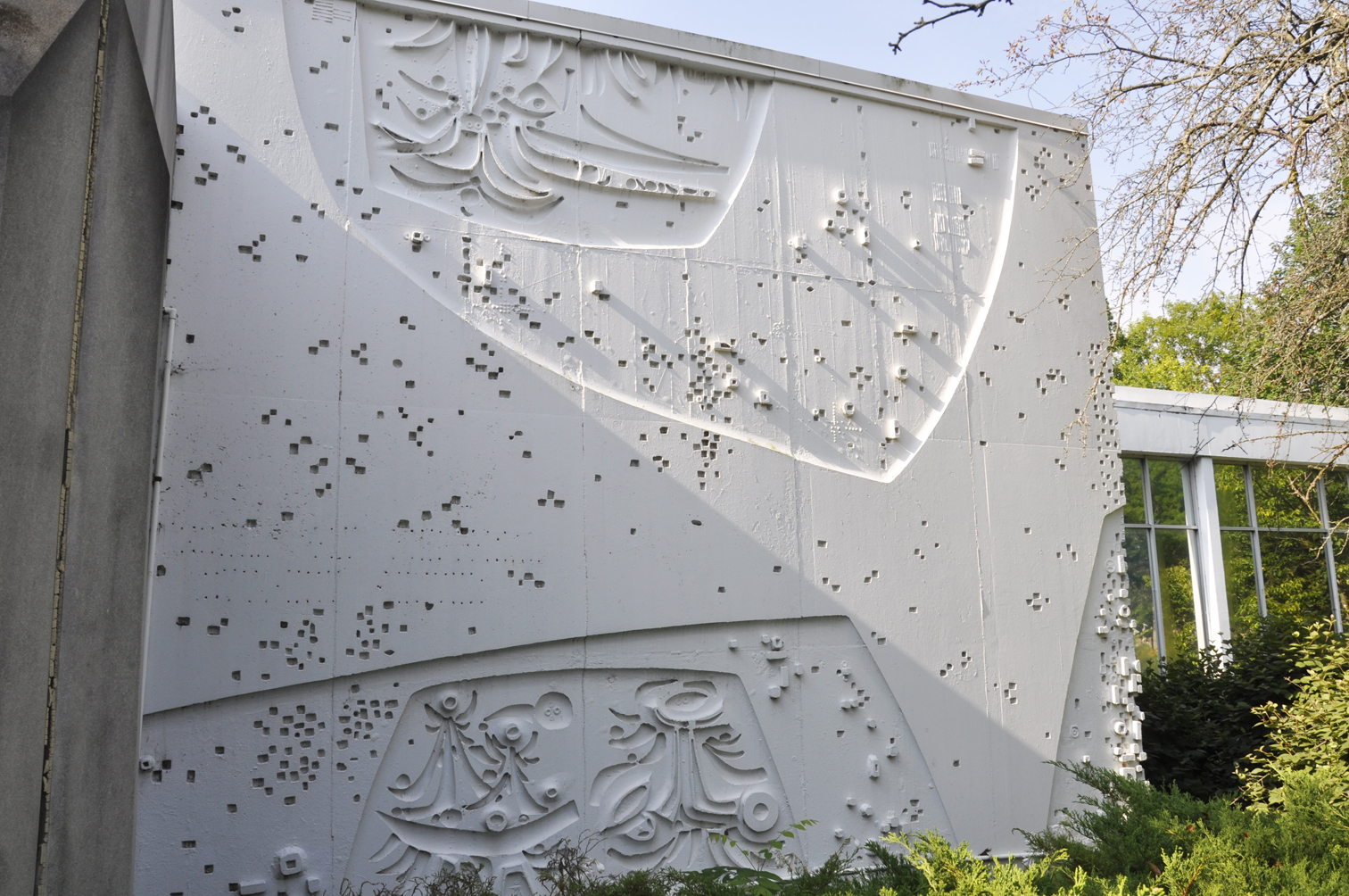 The Olt Student Center at Anderson University was built in 1963. This concrete panel at the original entrance is probably the work of Robert Youngman. For more, see this website. [map]
