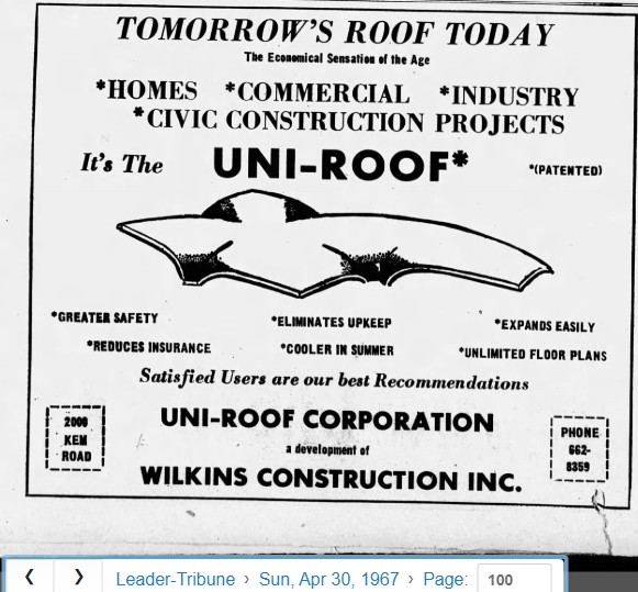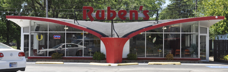 This building and the Ruben's building below were built with the same concrete shell, "Uni-roof" design which was used in Marion, IN for several buildings including the Wilkins House which was designed by Fran E. Schroeder and built in 1963 for Arnold Wilkins. Wilkins then had the Uni-roof design patented for his construction company. A fire station and a dry cleaners were built in Marion using this design. However, those buildings were demolished. For more, see this website. |