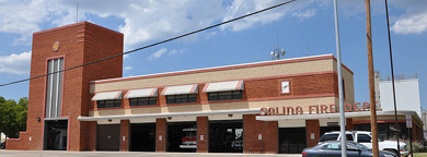 | This Salina Fire Department building is known as Fire Station #1. It was built in the early 1950s. The building was remodeled slightly around 2013. Additions were added to the sides of the building and the original sign was moved to the left side of the building. A new, similar sign was added to the front right of the building. [map] |