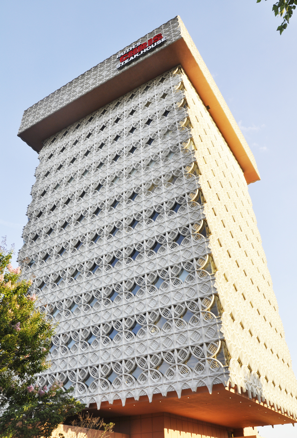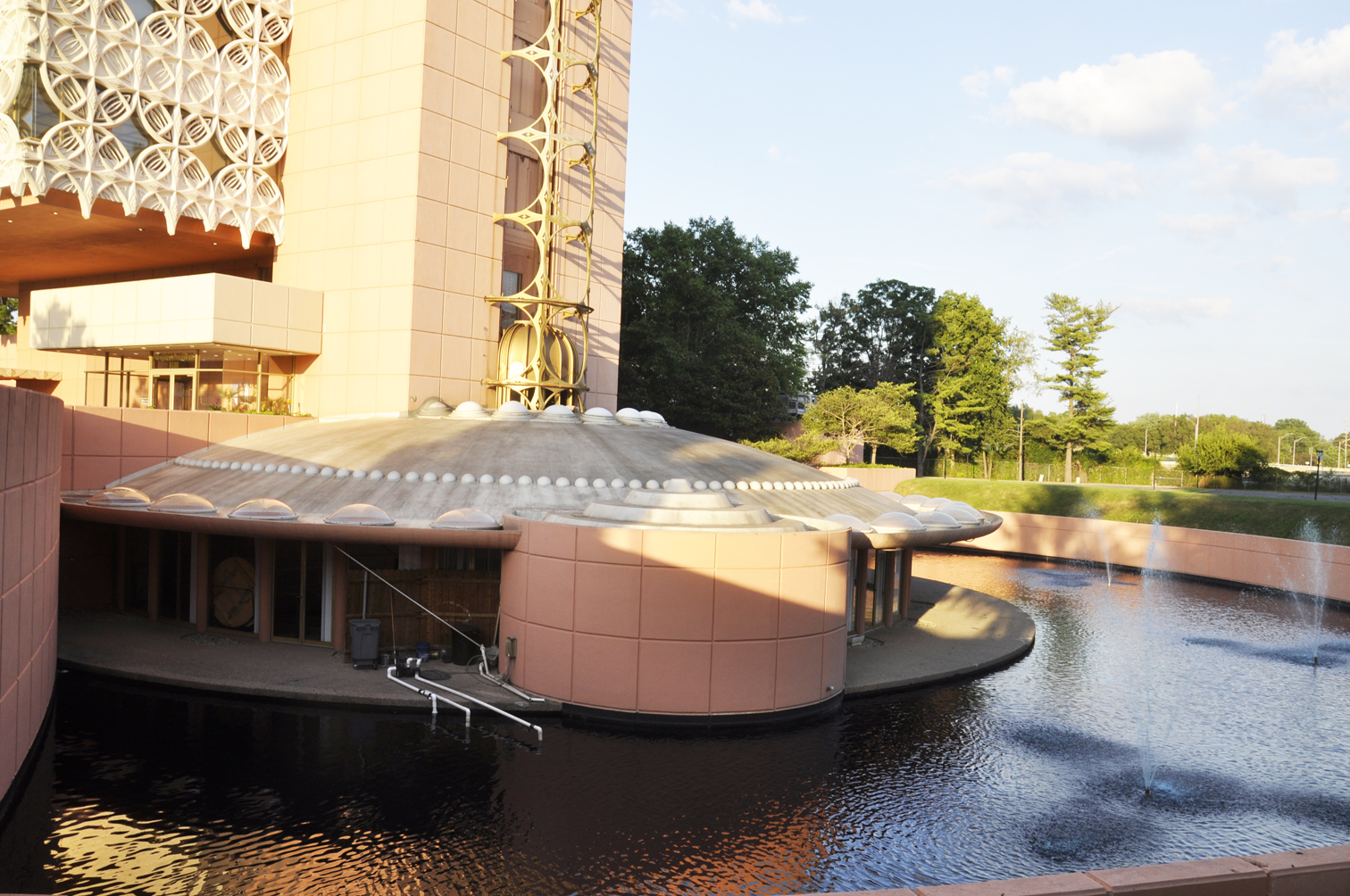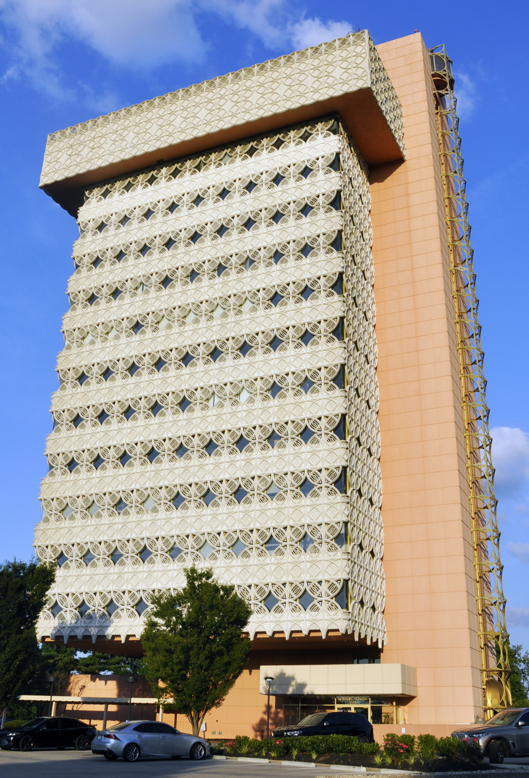 | The Lincoln Tower was built from 1965-1966 for the Income Life Insurance Company. It was designed by William Wesley Peters and Taliesin Architects, based on a Frank Lloyd Wright design from the 1940s for a store in Ahmedabad, India. The top floor of the building housed the Terrace Restaurant, accessed by a gold elevator on the side of the building. It is now occupied by Ruth's Chris Steak House. The Lincoln Tower became the Kaden Tower in 1986 and then the Wright Tower in 2023. The round building at the base of the tower and elevator is now called The Plaza at Wright Tower and is used as an event venure. The separate round building shown in the bottom row of photos above originally housed the Liberty National Bank and Trust Company. It now houses a real estate office. For more, see these websites: 1, 2, and 3. [map] |