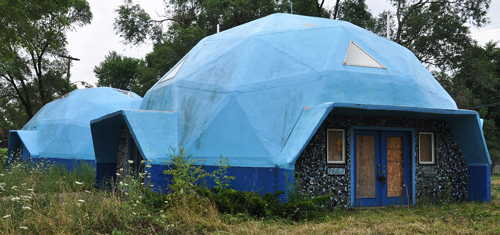 This Dome House was built in 1998. It consists of two connected domes. The owners added mosaics around the doors. The house has been vacant since at least 2009. This photo is from 2011. By 2013, the domes had been painted white but still appeared to be vacant. They were still vacant in 2020. For more, see these websites: 1, 2, 3, 4, and 5. [map] |