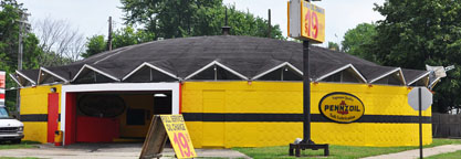 The Oil Exchange building was built in 1959 as a muffler shop. The interior features 12 bays oriented around a turntable. Cars would be driven to the turntable at the center and be spun around to enter the desired bay. [map] |