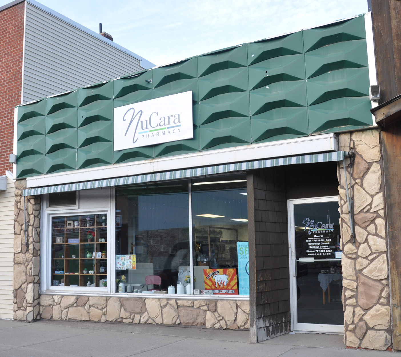 This mid-century slipcover was painted gold when the building housed Sheyenne Valley Drug. I believe these modular plastic slipcovers were all painted gold originally like this example in Muskogee, OK. [map]