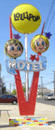 The Lollipop Motel was built in 1959. It is believed to have been named after the Chordettes' 1958 hit version of the song "Lollipop". The sign is about 25 feet tall and may have been designed by Harry Lanza. A vintage photo of the sign reveals the pole was originally painted red and white like a peppermint stick. The round piece on top of the sign looked more like a lollipop with purple and white stripes. According to one source, there may have been Burma Shave style signs (phrases in sequence) promoting this motel along State Rte. 47 in New Jersey.