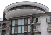 | The Royal Hawaiian Resort was built in 1969. It was named after the Royal Hawaiian in Oahu, HI. The motel uses lava rock extensively on its facade. The flying saucer structure on the roof was once a restaurant but it is now used as the owner's penthouse. [map] |