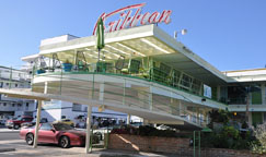 | The Caribbean Motel was built in 1958. It is a real stand-out with its flying ramp walkway, horseshoe-shaped pool and rooftop sign. This was the first motel in Wildwood to use plastic palm trees. For more, see this website. [map] |