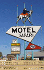 The Motel Safari was supposedly built in 1959 as the Best Western Motel Safari. The balls on the sign poles were originally much larger. In 1962, the Best Western crown was removed from the sign and "Clyde" the camel was added. The motel must have been related to the Caravan Inn chain at some point. Identical signs with the camels were used at their locations in Phoenix, AZ; Anaheim, CA; Sacramento, CA; Bakersfield, CA; and elsewhere.