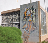 | This Church of Jesus Christ of Latter-day Saints stake center and recreational facility was built in 1963. In 1971, the building began housing the Reed Whipple Cultural Center. These photos are from 2014. In 2015, there were plans to use the building for the Cultural Corridor Theater Center. However, those plans fell through. The mosaics on the front of the building, under the signs, were uncovered. In 2019, it was announced that the building would serve as an extension for the Neon Museum which is located across the street. However, those plans changed as well. In 2022, the building was demolished. |