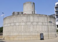 | The Pro Football Hall of Fame was designed by Robert E. Forsythe and opened in 1963. The overhead photo, taken at the museum, shows the original two buildings (additional buildings have been added over the years). Because the building's design was circular with a ramp to the second floor, there was concern that visitors would bump their heads on the ceiling while walking up the ramp. Therefore, Forsythe created a dome - in the shape of a football. For more, see this website. [map] |