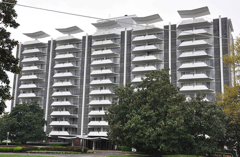 | The Imperial House Apartments were designed by Earl Swensson and built in 1963. The building had been vacant since 2006 and was demolished in 2017. For more, see this website. |