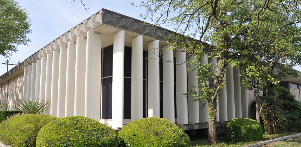The Central Library branch of the Waco-McLennan County Library was designed by Bush & Witt and built in 1961. These photos are from 2006 and 2011. Later in 2011, the building was remodeled. The entrance has been moved to the side of the building and those details have been lost. The steps and doors were replaced with protruding glass windows. [map]
