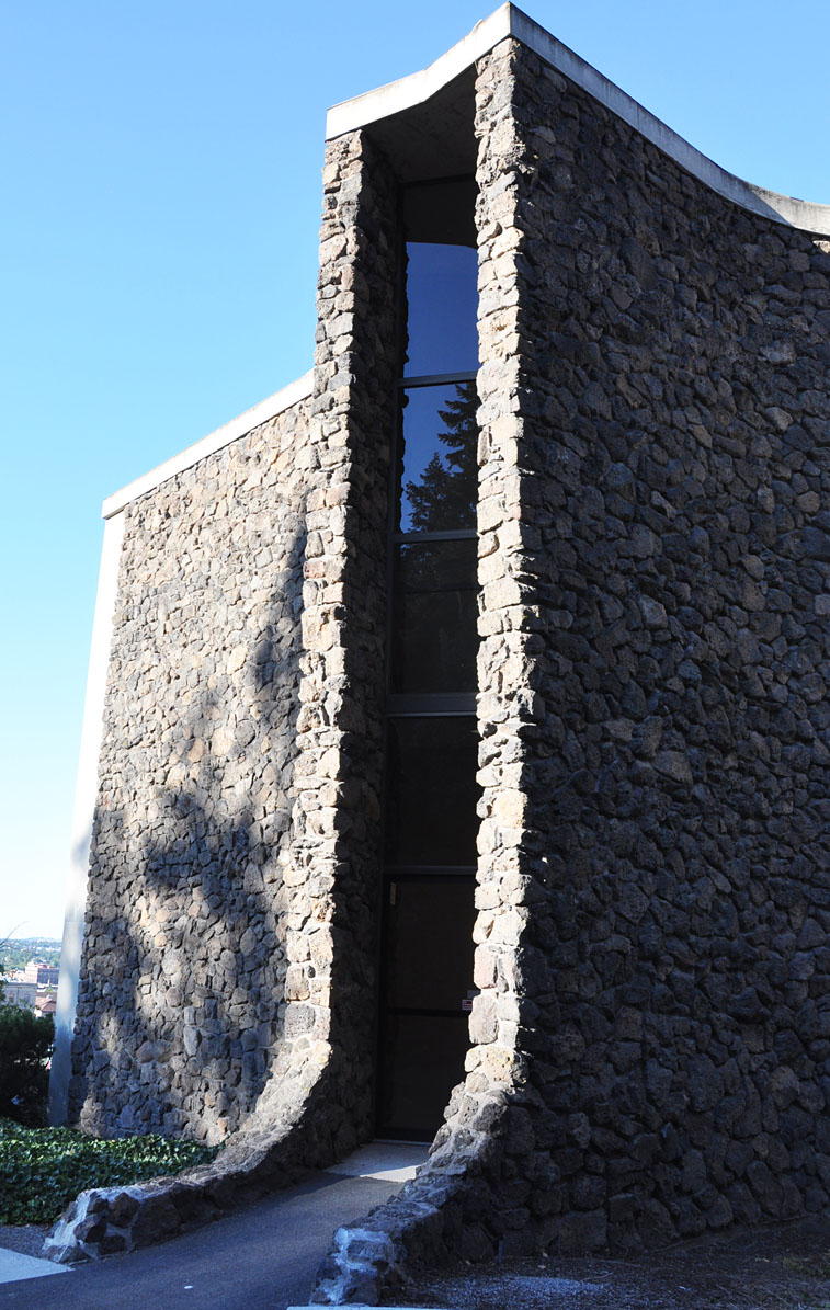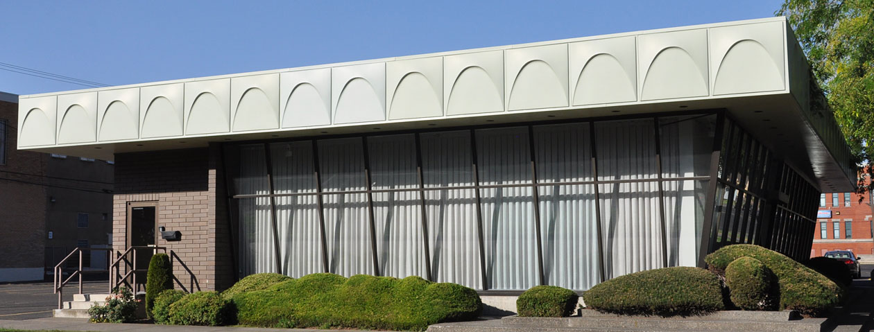 | The Clark County Title Company was built from 1962-1963. The building later housed Vancouver Technology Services. It was demolished around 2019. 32 of the sculpted concrete panels created by James Lee Hansen were saved by the city and put in storage. In 2022, some of them were installed at the Esther St. underpass. For more, see this website. |