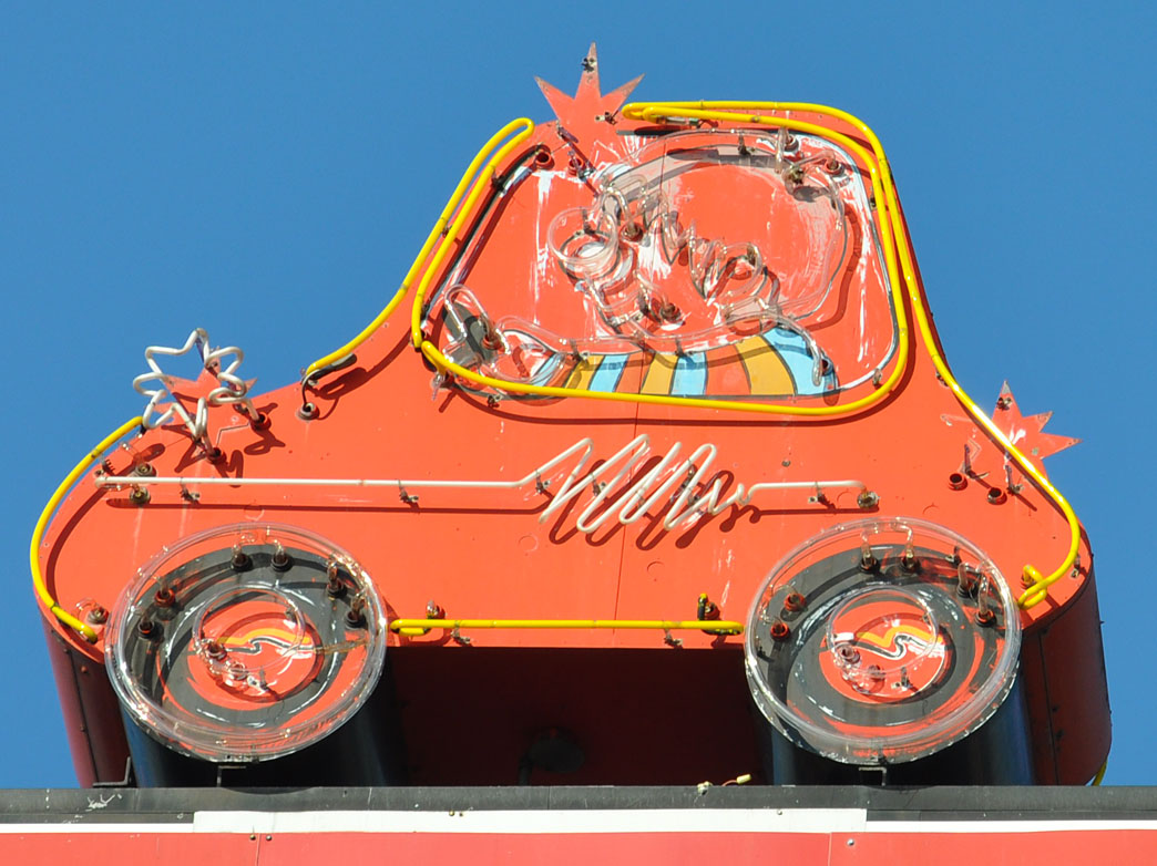 | Like-Nu Auto Paint & Body Works was established in 1947. This sign was built then and was attached to the building as a projecting sign. When the business moved to its current location in 1997, the sign was installed on a pole. The panels are about seven feet wide. The sign has been continuously lit with red and white neon. The radiating neon surrounding the car suggests shining, new paint. What's under the tacked-on piece of metal on the side of the car is anyone's guess. It might be the original owner's name or a phone number. [map] |