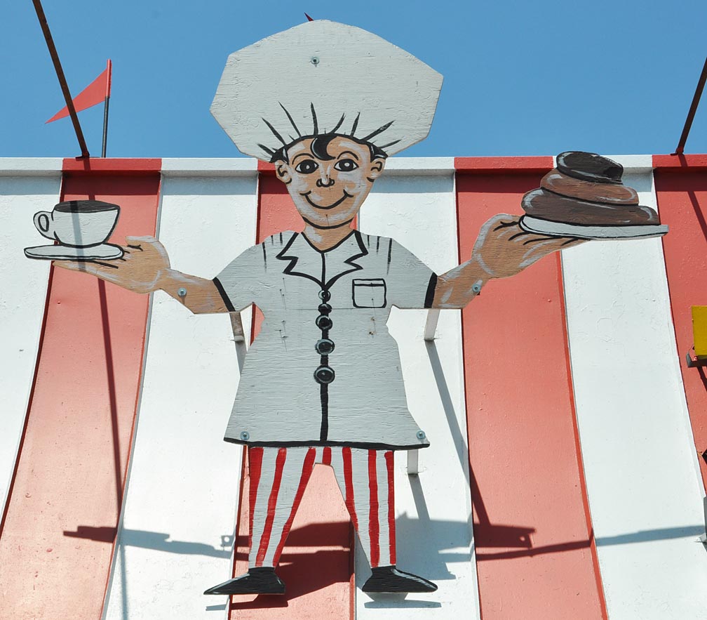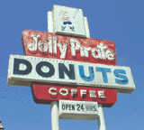| As far as I know, the Jolly Donut is not related to Jolly Pirate Donuts described above. The plastic panel depicting three donuts was replaced with a new one between 2007 and 2012. Hidden behind the brick is a Mountain View diner from 1954. For more, see this website. [map] |