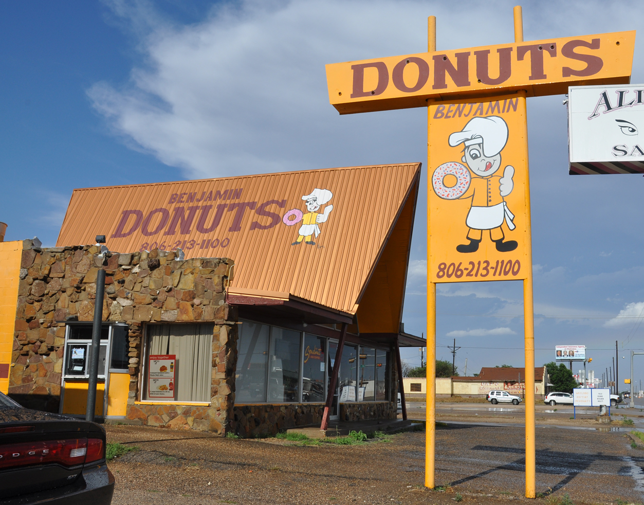 The Spudnut Shoppe in El Dorado opened in 1948. This sign might be from then. The store moved to its current location around 1968. [map] The Spudnut Shop in Plainview opened in the early 1950s. The store moved to this A-frame building in 1968. The store became Benjamin Donuts in 2014. It now houses Tasty Donuts. The building and sign have been painted white. [map] |