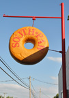 South Paw Donuts featured this giant donut sign. The store has been here since at least the 1990s. This photo is from 2010. The store was still there in 2013. However, in 2018, the building and sign were gone. The Six O One Donut Shop is named after its address, 601 South Broadway St. The building is a former gas station. Around 2018, the sign was painted green. The giant donut on the roof is gone now. [map] |