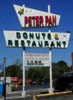 | This former Mister Donut has housed Peter Pan Donuts for many years. These photos are from 2005. This store closed in 2008 and has been vacant since then. The building is now in very bad shape. By 2019, the canopy had fallen off and was laying on the ground. The building and sign were demolished in 2021. For more, see this website. |
