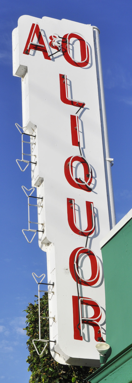 The A&O Liquor store was named for its location at the intersection of Alameda and Olive Aves. The sign is from the 1940s. In 2025, the space began housing Olive Wine & Liquor and the sign was restored. For more, see this website. [map] This sign at Val's Liquors originally advertised for Johnson's Liquors. Johnson's moved to this location in 1962 and this sign might be from then. The top panel originally read "Johnson's." The store became "Val's" in 1976 and that panel was adapted then. [map] The Geary Parkway Motel sign is probably from the 1950s. It features 17 neon arrows alongside the panels. For more, see this website. [map] Forsyth's Furniture was established in 1910. This sign is probably from the 1950s. [map] |