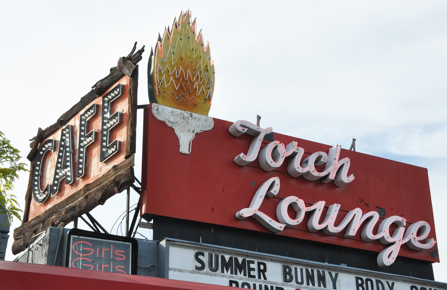 | The Torch Lounge has been here since at least 1946. The business is now a strip club. The sign has apparently been reworked many times. The Torch Lounge sign panel was painted red around 2016. [map] |