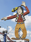 The Chief Diner opened in 1945 as the Pioneer Diner. It was renamed the Chief Diner in 1947. This sign was clearly inspired by the one in Cincinnati. The Durango Indian sign was built in 1957. It is about 20 feet tall. His arm waved and his eyes flashed. In the mid or late 1950s, the restaurant was renamed the Chief Restaurant and a new sign panel was added below the Indian sign. With the addition to the sign, it was about 50 feet tall. The name on the building was also changed as well. After the restaurant closed in the early 1980s, the sign was purchased by Jackson Clark for $300. I don't know what happened with the totem pole sign which was also removed from the restaurant. For a few years, the Indian sign was displayed in front of his father's Pepsi plant. It still had the Chief Restaurant text panels at that point. While it was there, the Indian held a Pepsi can sign. Later, Clark spent $4,000 to refurbish the sign and move it to his business, the Toh-Atin Gallery. Due to the City's sign height restrictions, the sign panels were removed at that point. The neon was also removed. For more, see this website. [map] The connection between these two Indians signs still remains a mystery. While both signs are about the same size and featured neon and waving arms, they are not identical. The Durango Indian has smaller feet and his legs are not as bowed. The Cincinnati Indian's raised hand is also larger. It seems more likely that the Durango sign was built from a photograph of the Cincinnati sign rather than both signs being built by the same sign shop. The sign at the Miracle of America Museum is not mechanical but I'm including it anyway since it was obviously inspired by one of these signs, mostly likely, the one in Durango. The sign was originally installed at the Blue Bay Resort Restaurant in Polson. It may have been built in the 1970s and is about seven feet tall. [map] |