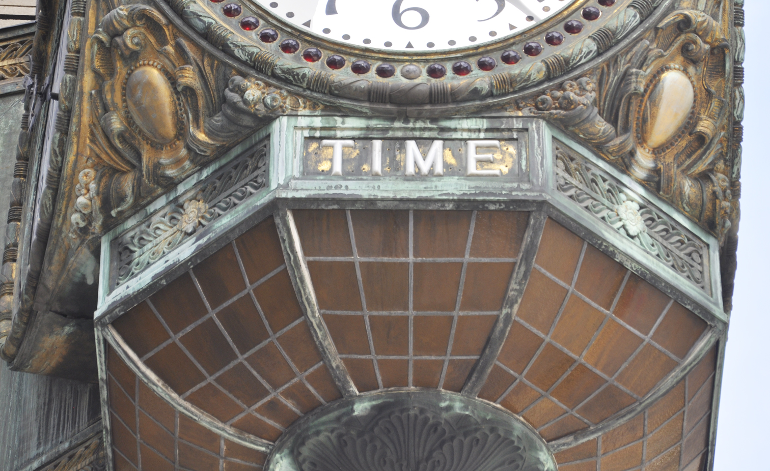 | The Father Time Clock was installed in 1926 by the Elgin National Watch Company. It weighs six tons. The clock faces and glass balls surrounding them are backlit at night. The "TIME" letters are backlit opal glass. For more, see this website. [map] |