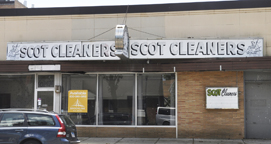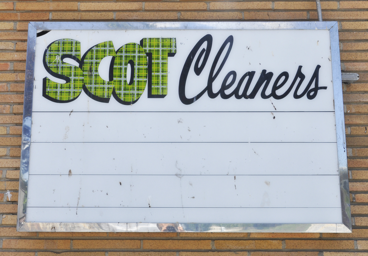 | The Scot Cleaners has opened by 1965. Before that, by the mid-1950s, the building housed Anderson Cleaners. The Scot signs are probably from the 1960s and the arrow sign is probably from the 1950s. The business has closed but these signs remain. [map] |