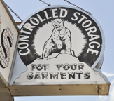 | DeLuxe Cleaners was founded in 1930. When DeLuxe moved here in the early 1940s, this group of neon signs was created for their new location. Their polar bear sign signifies that DeLuxe offers refrigerated vaults for furs, leather and suede garments. The bear is lit with blue neon during storage season. The pylon sign which acts as a canopy support (second row above) was restored in 2009 after being struck by a car and damaged in a storm. The signs are lit at night. For more, see these websites: 1 and 2. [map] |