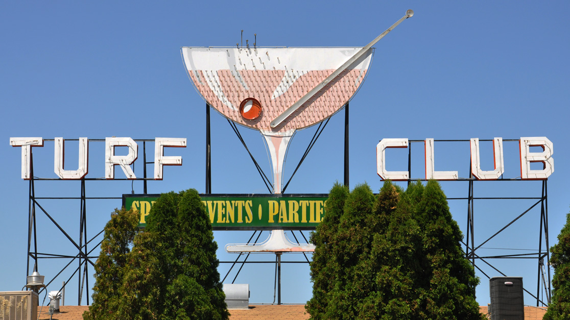 | The Turf Club opened in 1946. The name was a reference to the horse racing track located across the street at the time. The business at that time was a drinking and gambling establishment. This sign was built around 1953 by the Young Electric Sign Company (YESCO) shop in Las Vegas. It is about 45 feet wide. The "Turf Club" letters are lit with red neon. The champagne cocktail coupe glass is about 20 feet tall. It is outlined in blue and contains about 300 bulbs. About one-third of the bulbs inside and above the glass flicker at night to simulate bubbles. The clear bulbs appear golden at night. The stirrer and cherry are lit with red neon. The sign had a major restoration in 1969. To comply with the local sign ordinance, it must be diligently maintained to allow it to continue to be lit. The business has a monthly contract with Lytle Signs. The plastic panel at the bottom of the sign previously read "Fine Food & Dining." It was changed in the late 1970s when the business began offering banquets. Sometime after 2022, it was changed to read "Since 1946" and the neon "Turf Club" letters were replaced with backlit plastic versions. For more, see these websites: 1 and 2. [map] |