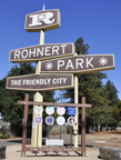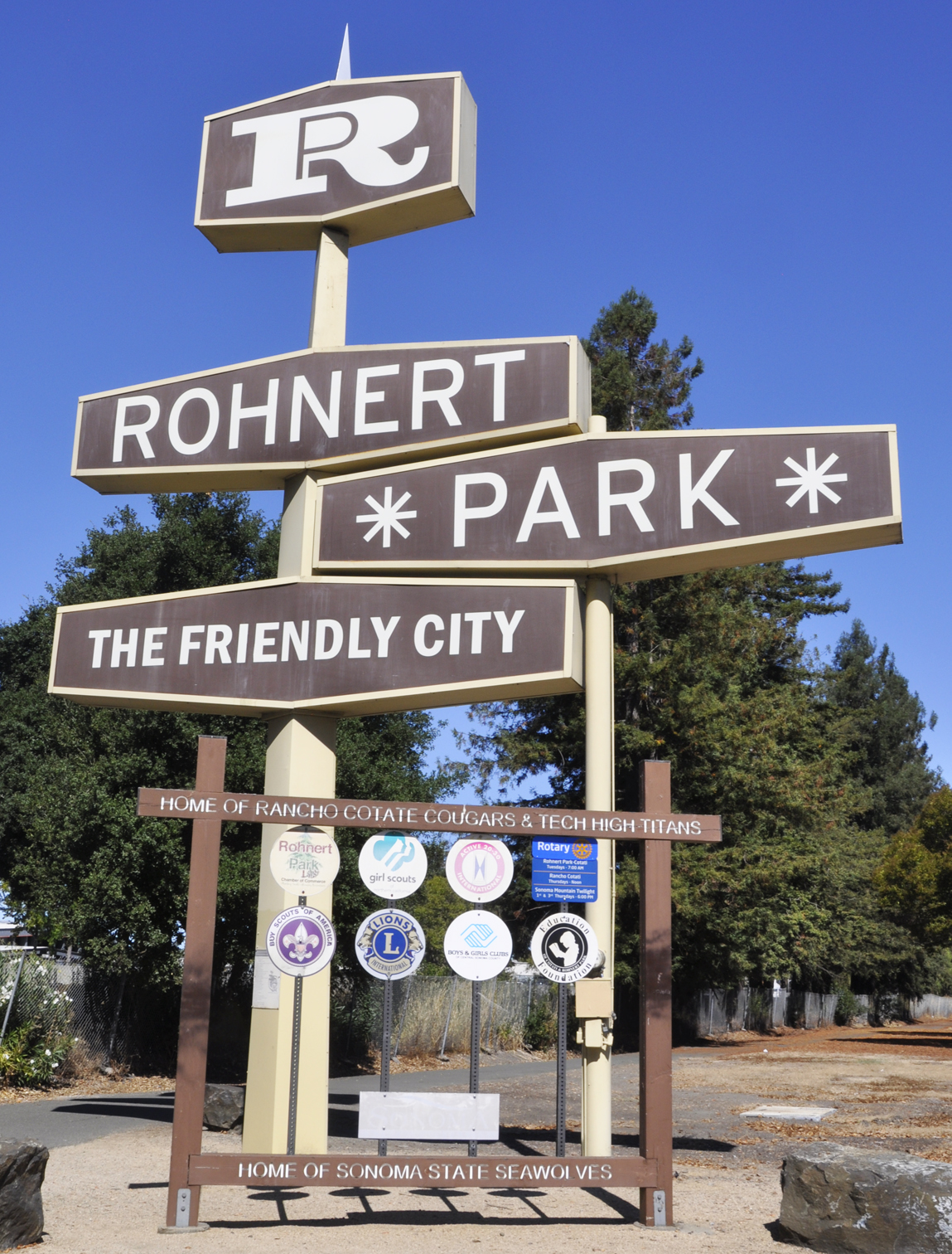This backlit plastic Welcome sign in Rohnert Park was installed in 1961. The top panel originally revolved. In the 1980s, the city replaced the bottom panel that read "Sonoma State University" with "The Friendly City." The sign was renovated in 2012. [map] |