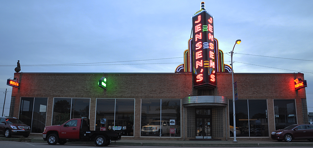 | Jensen's of Fairview was established in 1931 as a Case tractor dealership. Jensen's began selling Buick, Pontiac, and GMC in the 1960s so those signs must have been added to the building then. I don't know when the Jensen's sign was built but the building might have been built or remodeled in the 1940s. These photos are from 2011. In 2012, the Case Eagle statue was stolen. [map] |