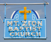 | The Mt. Zion Baptist Church features three neon signs. It's hard to guess the age of them. The one on the left might be a replica or an older sign. The other two appear to be later and/or repainted. For more, see these websites: 1 and 2. [map] |
