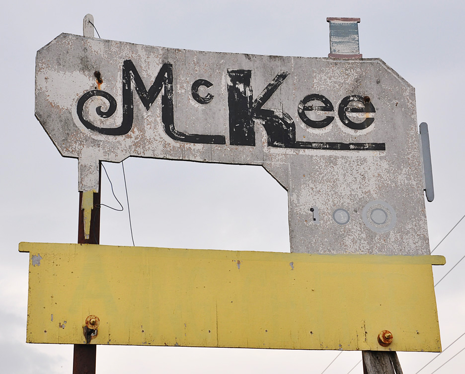| I think the McKee Sewing Center was established in the mid-1980s. However, these signs appear much older than that. The man may have had a moving arm or leg originally. By 2013, the one-legged man was still there but the sewing machine sign was gone. By 2017, the man was gone. He was apparently removed, refurbished, and reinstalled. [map] |