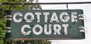 Dame Fortune's Cottage Court was built around 1950 as the Cottage Courts. It was later known as the Cottage Motel. The motel was renovated from 2016-2017 and was renamed Dame Fortune's Cottage Court. This 1930s-inspired sign was built in 2017. In 2018, the same sign shop, Meeks Neon, built a similar sign for the Best Motel. [map] |