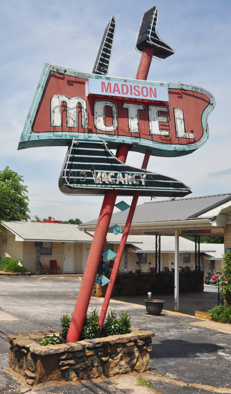 The Faubus Motel sign appears to be from the 1950s. It was originally named the Elms Motel. I don't know when the sign was adapted to read Faubus. In 2013, the business became the Madison Motel. The old name was covered up on the sign but otherwise it is the same. [map]