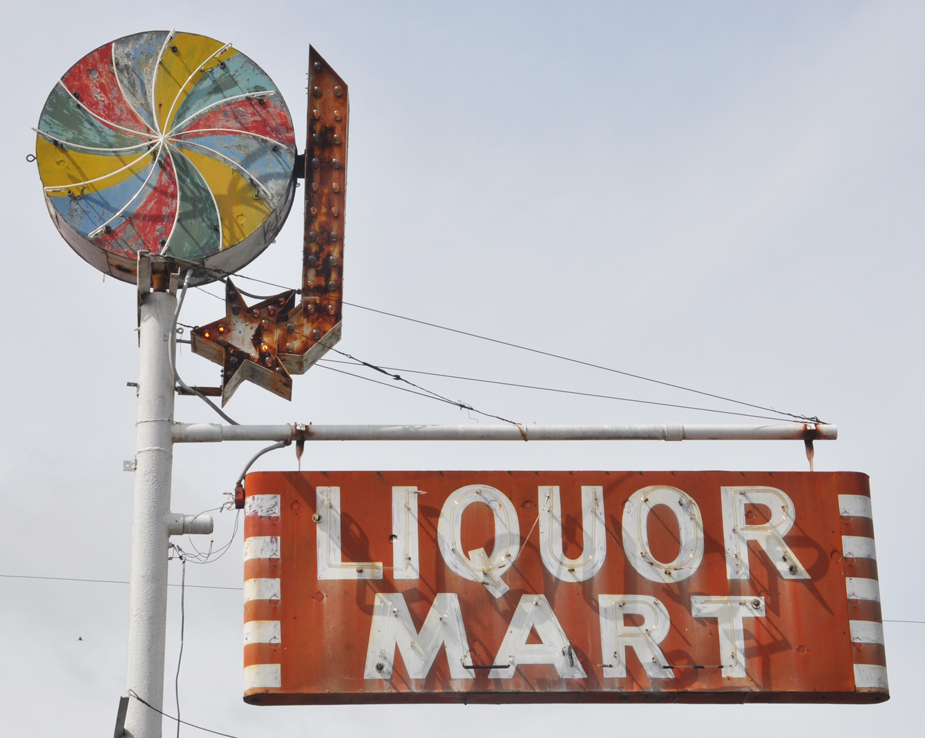 The Liquor Mart text panel might be from the 1950s. The patched neon tubing holes make me believe that the sign might have had different letters originally. The neon pinwheel sign and bulb arrow are probably from the 1960s. [map]