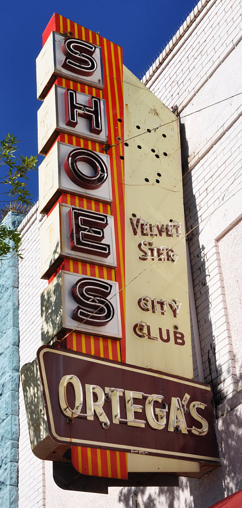 The Ortega's Shoes sign must have had a Red Goose or Weather-Bird piece where the holes are on the upper right. The business closed in 2018 and the sign was gone by 2022. The Oasis Car Wash was still operating when this photo was taken in 2012. The sign originally advertised for the Oasis Motel. It was probably built in the 1950s or 1960s. By 2022, the sign was gone. |