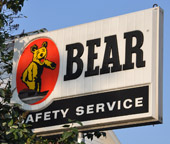 This Bear Manufacturing sign in Seattle is installed in the window at Ball Graphics. This upper part of the sign was purchased at a swap meet and restored at a local sign shop. This sign is six and a half feet wide. [photo thanks Dennis Hicklin] [map]