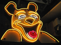 The Bear sign in Albuquerque is part of a private collection. The rusting vintage sign's neon was installed by Evan Voyles of Neon Jungle in Austin, TX. The other plastic sign is probably from the 1960s or 1970s.