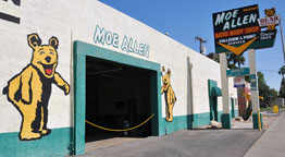 | The Moe Allen Auto Body Shop opened in Phoenix, Arizona in 1955. The pole sign and painted bears which flank the service bay had been there since then. The pole sign and "Moe Allen" letters on the building had neon originally. In 2018, the shop closed and the building was demolished. The sign was put in storage. It will be displayed at the Ignite Sign Art Museum which will open in Tucson, AZ in 2018. |