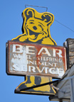 Lindstad Alignment opened at this location in 1945 and is still operating. This sign is probably from the 1960s. [map] Weldon's Tire Service opened in 1936. The shop has the same style sign as the one at Zorn's Service. Note the hanger above the bear's head. These signs are about four feet tall. According to the owner, the sign has been there since maybe the 1960s. [map] Cruz Tire & Truck Repair has the same style bear sign as those in Ida and Yreka. It is installed on the roof. [map] This bear sign was installed on the Thomson Brake and Alignment building around 2009. There is another one on the side of the building facing the other direction. The panels may have been split up from either a projecting or pole sign. [map] |