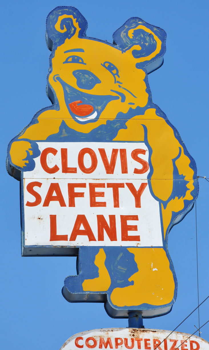 | Clovis Safety Lane is a full service repair garage. The shop opened in 1946. The pole sign outside is from around the mid-1950s. It never had neon. There are a couple of other Bear signs inside the shop. There is also some Bear equipment which is still in use. [map] |