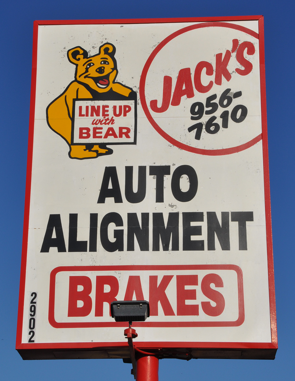 | Jack's Auto Alignment & Brakes features a sunken pit and plastic sign. [map] |