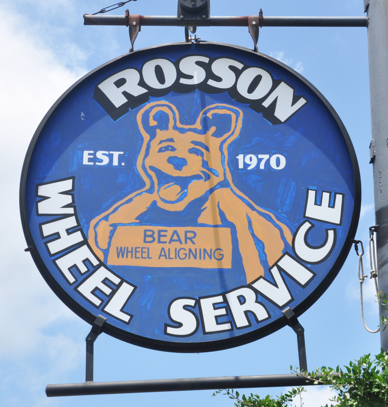 This plastic, vacuum-formed sign at Barnes Garage is from the 1960s. These signs must have been mass-produced but this seems to be the only one left on public display. [map] The Bear sign was for sale inside Shaw's Antiques when this photo was taken in 2019. The Bear sign at Zumwalt's Garage looks like a single-sided shop sign turned into a projecting sign. [map] Rosson Wheel Service was established in 1970. I don't know how long this sign has been there. [map] |